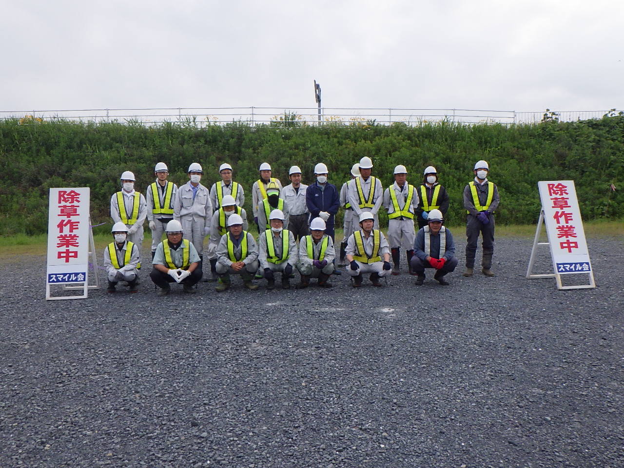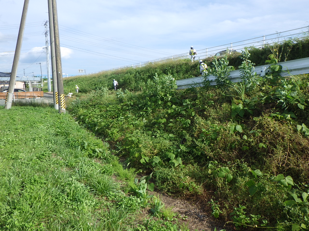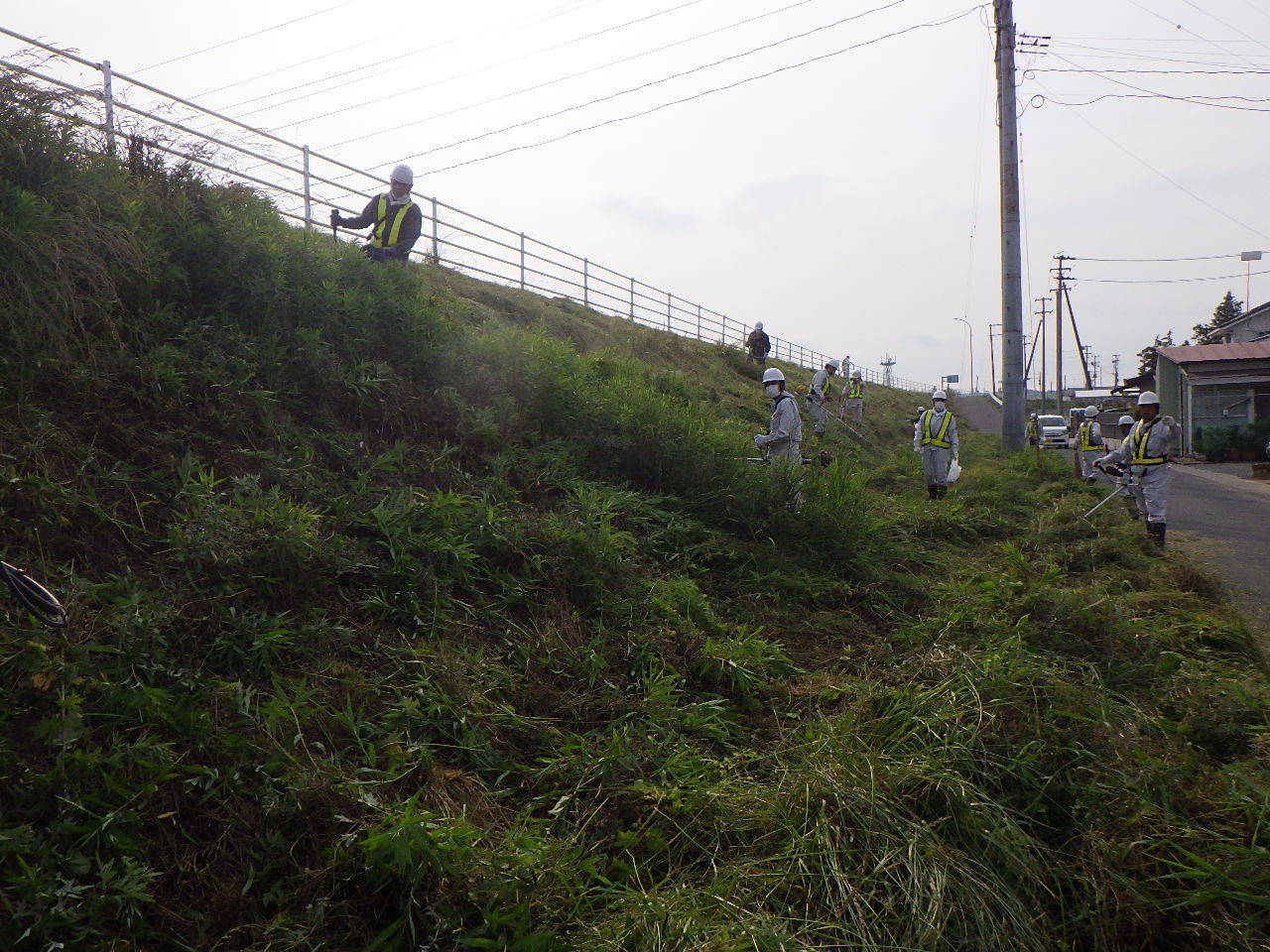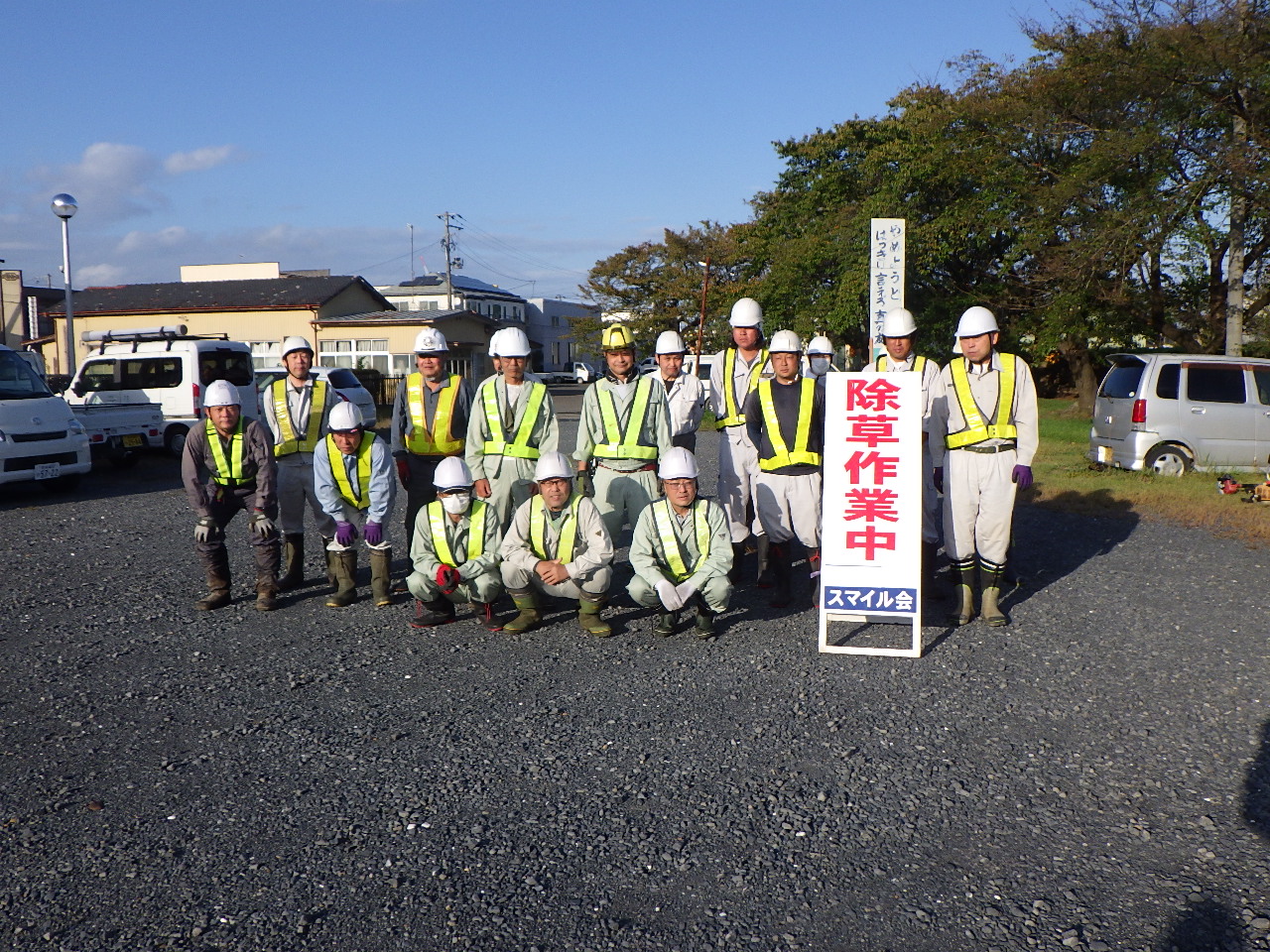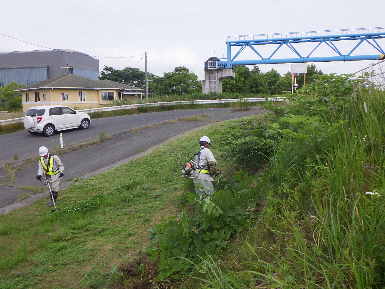 「スマイルサポーター」の活動に参加し、佐沼地区の光が丘球場付近にて草刈り作業を行いました。雑草やツタがかなり伸びており、作業に苦戦しましたが、熱中症と安全管理に気を付けながら作業を無事終えることができました。