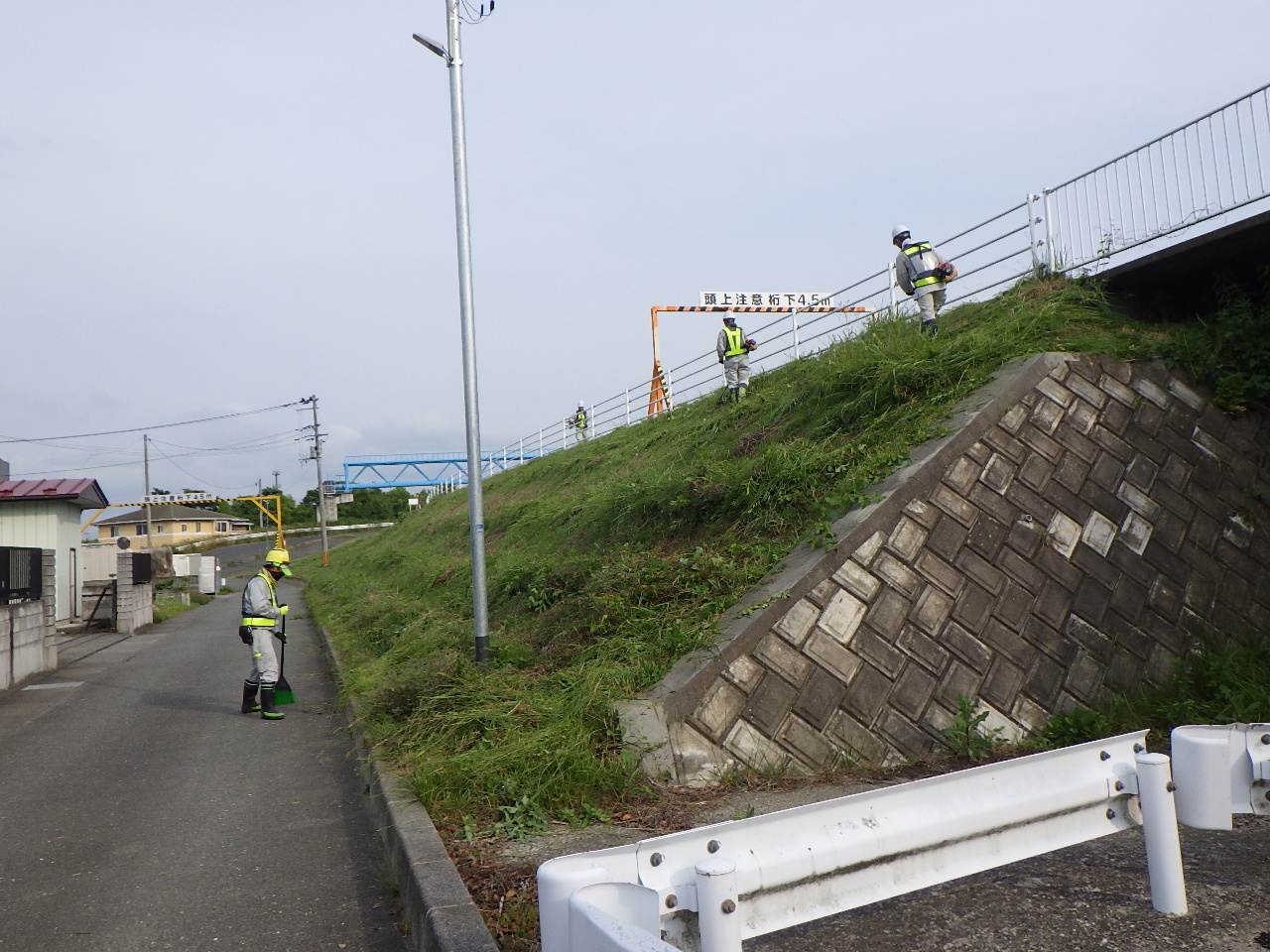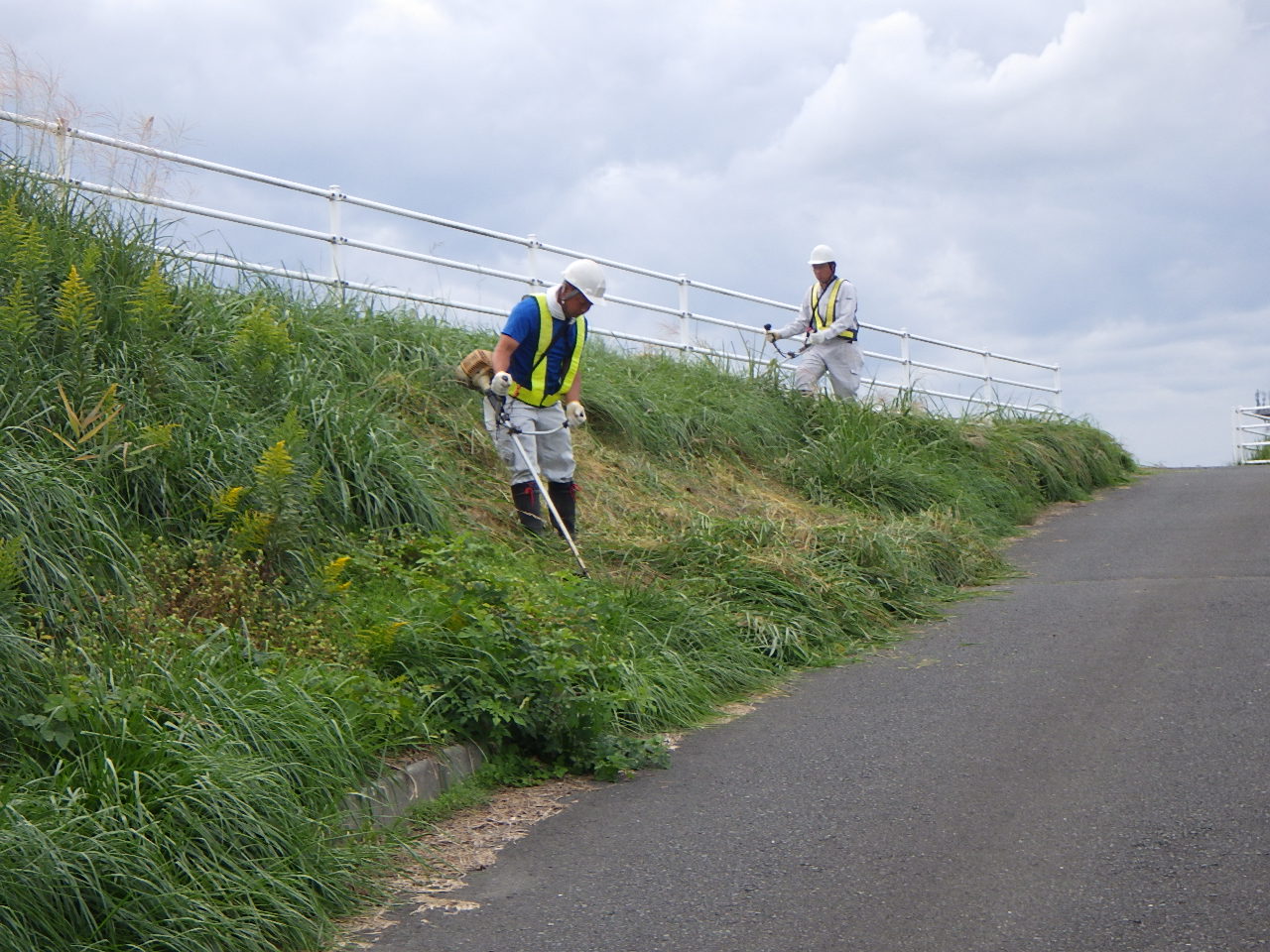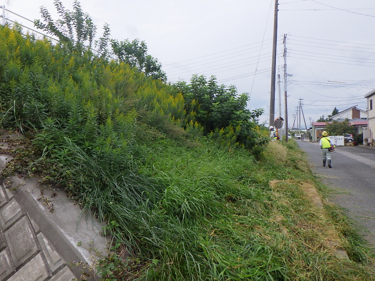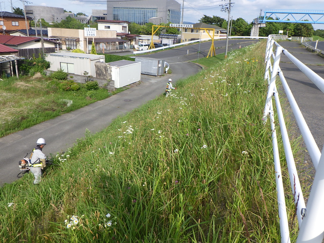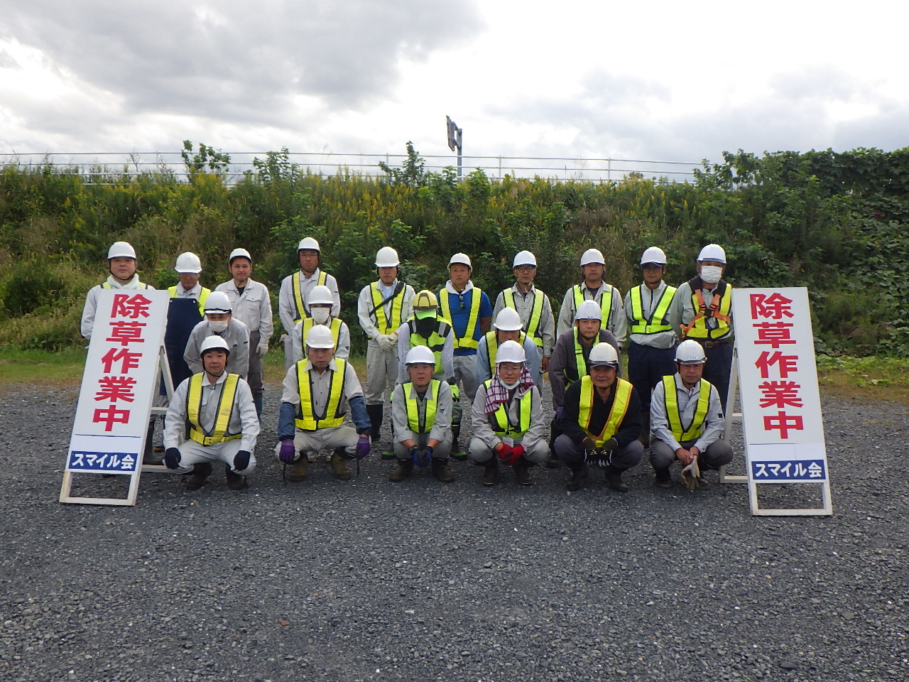 「スマイルサポーター」の活動に参加し、佐沼地区の光が丘球場付近にて草刈り作業を行いました。雑草やツタがかなり伸びており、作業に苦戦しましたが、熱中症と安全管理に気を付けながら作業を無事終えることができました。