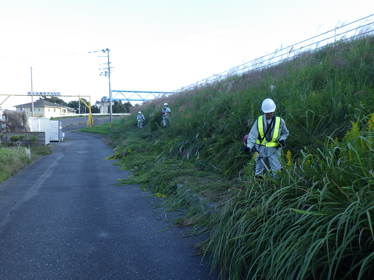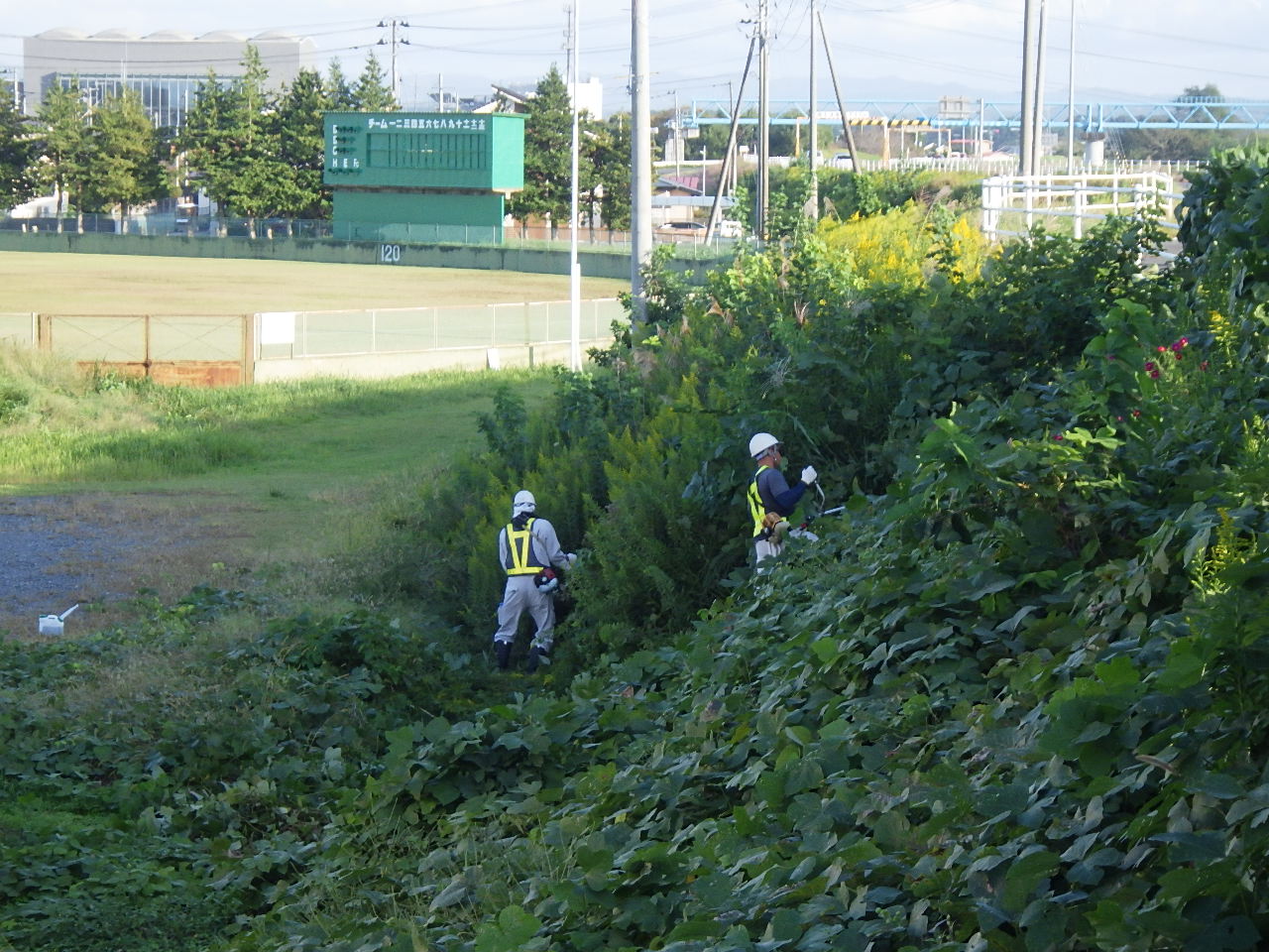迫佐沼公園(光ケ丘球場)近くの堤防の草刈り作業を行いました。午後3時半から開始しましたが、強い日差しと暑さの中での作業となり、
