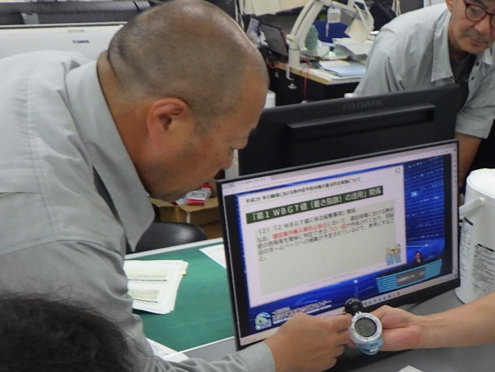 WEB講座を視聴しながら改めて熱中症の予防方法や対処方法などを再確認しました。WBGT指数計の使用方法も再確認、緊急時の対応など改めて学びました。