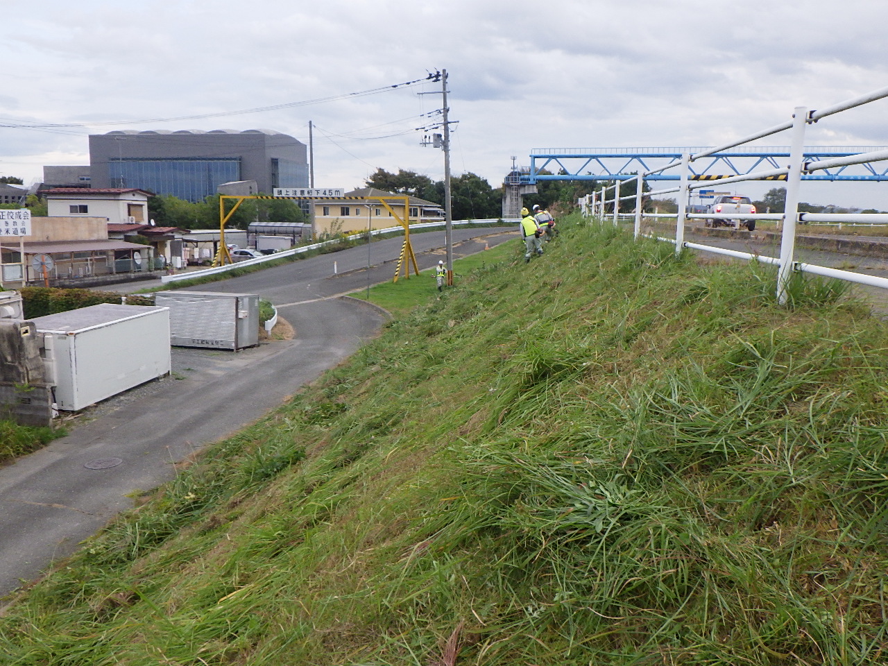 迫佐沼公園(光ケ丘球場)近くの堤防の草刈り作業を行いました。セイタカアワダチソウなどの大きな雑草が多く、草刈りには苦労しました。